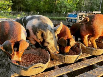 Our finished hogs are raised on the ground, just the way nature intended. Pigs are happiest when they're able to root and forage and play in the dirt. You can choose yours around weaning time, and we will grow them for you. They will weigh approximately 250 lbs at 6 months of age, which is optimal for processing. You can pick them up, or we will deliver them to you or a local butcher for an additional fee.
