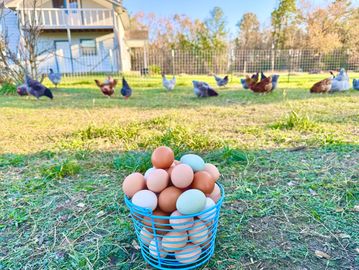 Our colorful assortment of eggs come from an equally diverse mix of hens that spend their days happily roaming their own pasture on our farm.